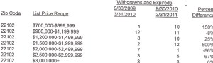 From quarter end 3/31/10 to quarter end 3/31/11, the number of withdrawn and expired listings for the price range of $700,000-$899,000 increased from 4 to 10 (or more than double), and for the price range of $1,200,000-$1,499,999 increased from 2 to 12 (or six times). This indicates that more sellers are not getting the prices that they expect and are taking them off of the market.