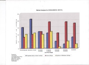 The table and chart below compare the number of active listings (the supply) to the number of properties sold or under contract (the demand) in the local real estate market of McLean 22102 by price range for the period from 9/22/10 – 3/22/11.  If you click on either the table or chart, you will get an enlarged view.